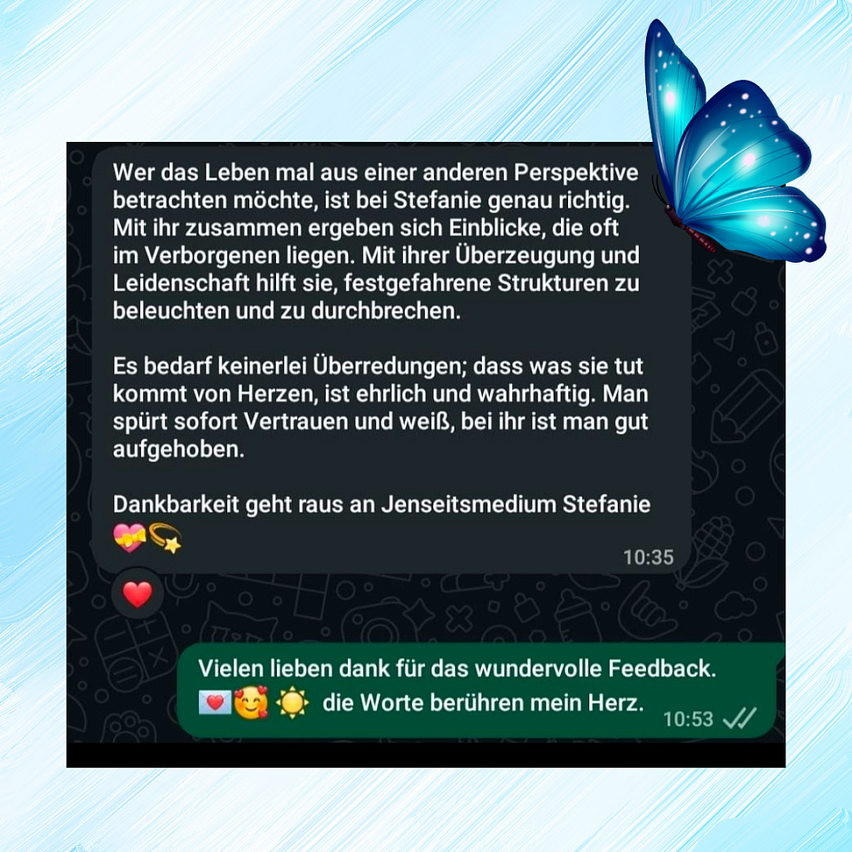 Es dient mir zur Weiterentwicklung, um für Euch noch Bessere und Tiefgründigere Jenseitskontakte führen zu können und möglichst viele Lichtvolle Seelen davon zu überzeugen, das es eine Große Hilfe, Segen und Trost zugleich sein kann!